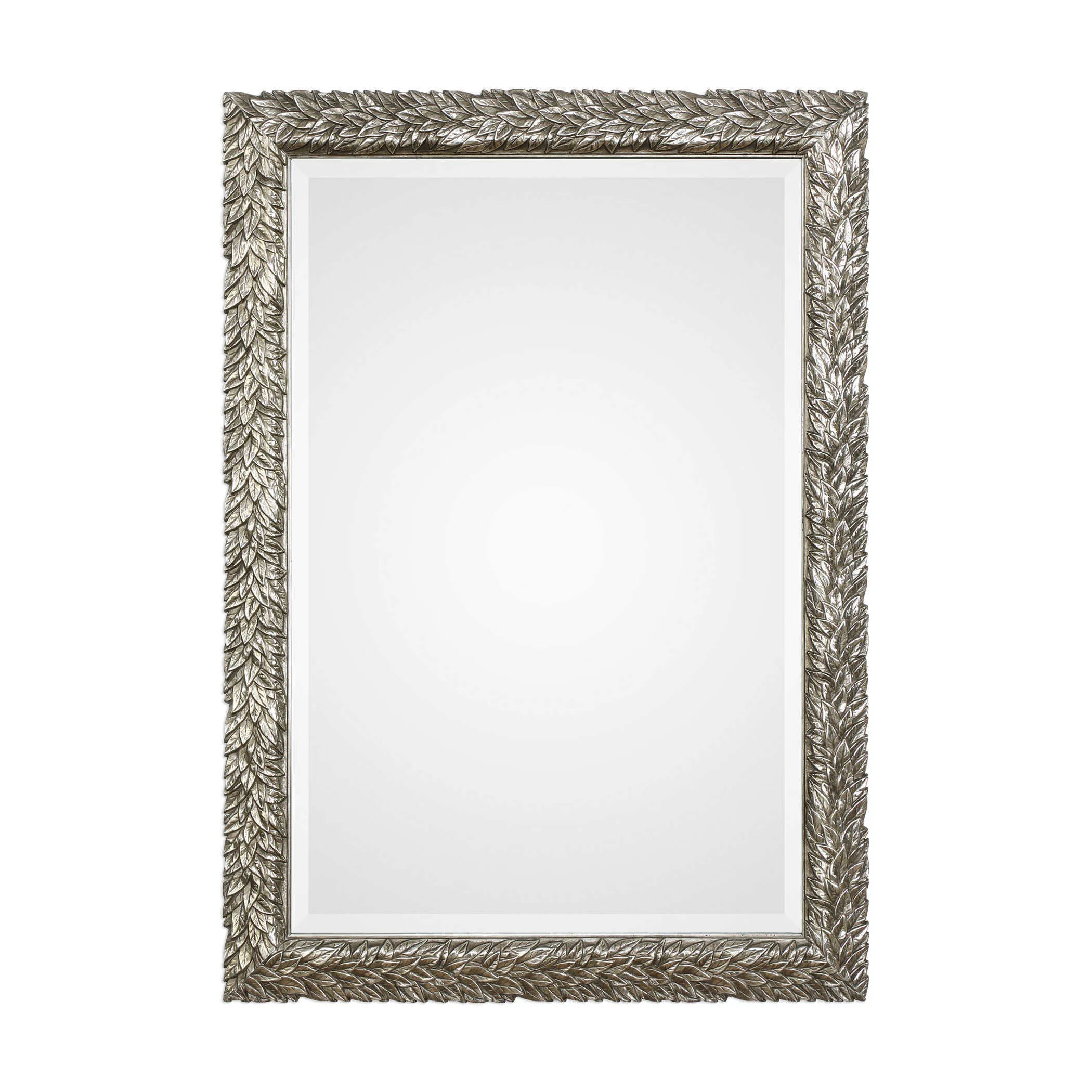 This flowing leaf design features a delicate, 3-dimensional texture, finished in a lightly burnished metallic silver. Mirror is beveled. May be hung horizontal or vertical.