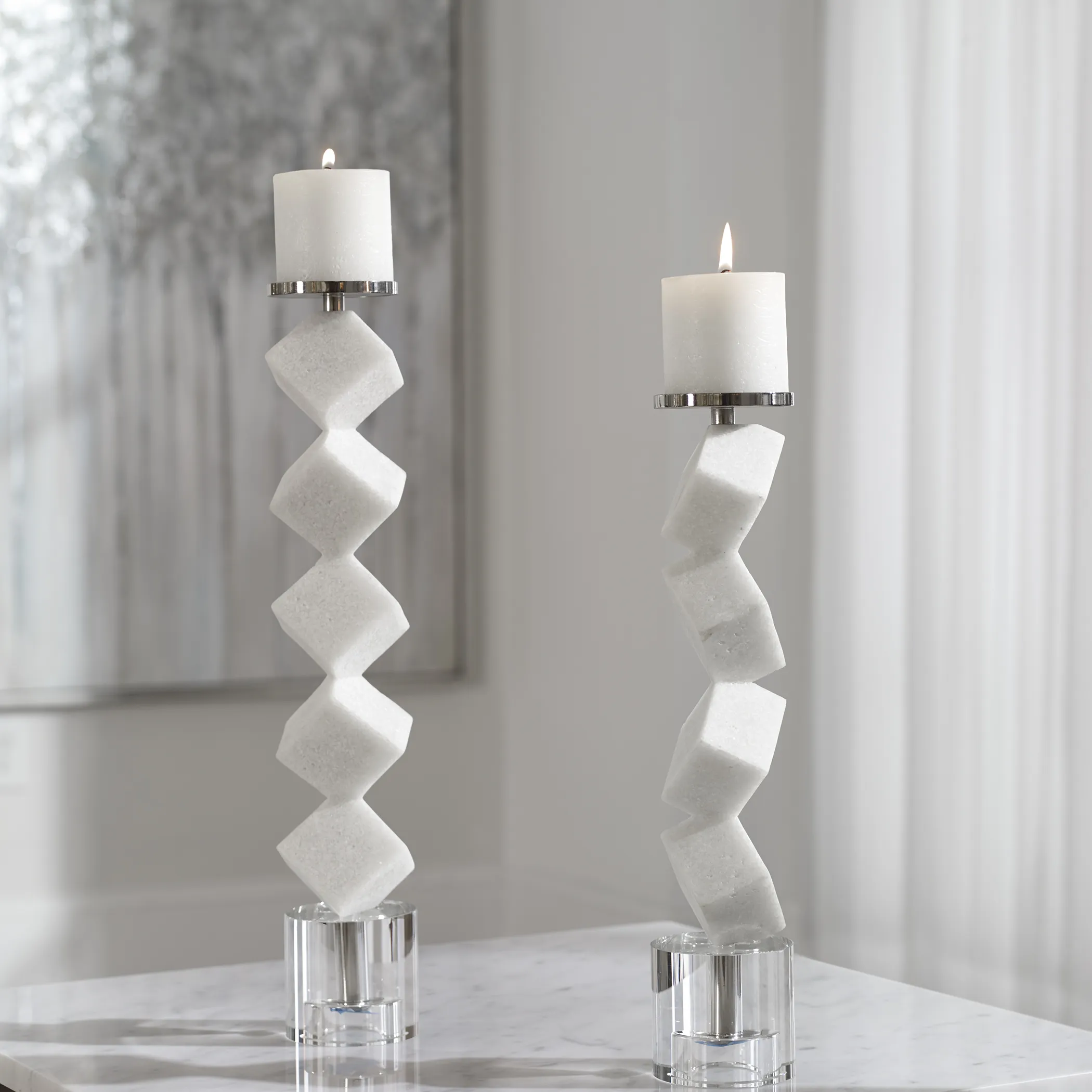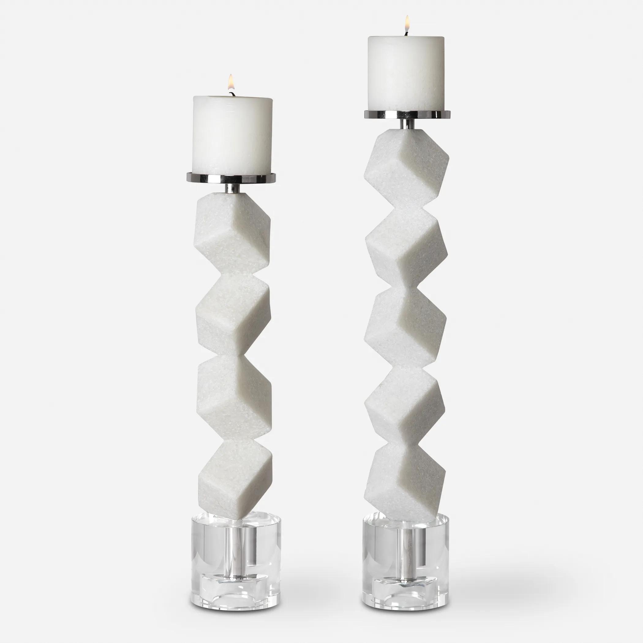 Set Of Two Candleholders Feature Stacked Cubes Are Crafted From Ivory Man-made Stone That Accurately Replicates The Look Of Thassos Marble Set Atop Crystal Bases With Polished Nickel Candle Cups. Two, 3x3 Distressed White Candles Included. Sizes: S- 3x16x3, L-3x19x3.