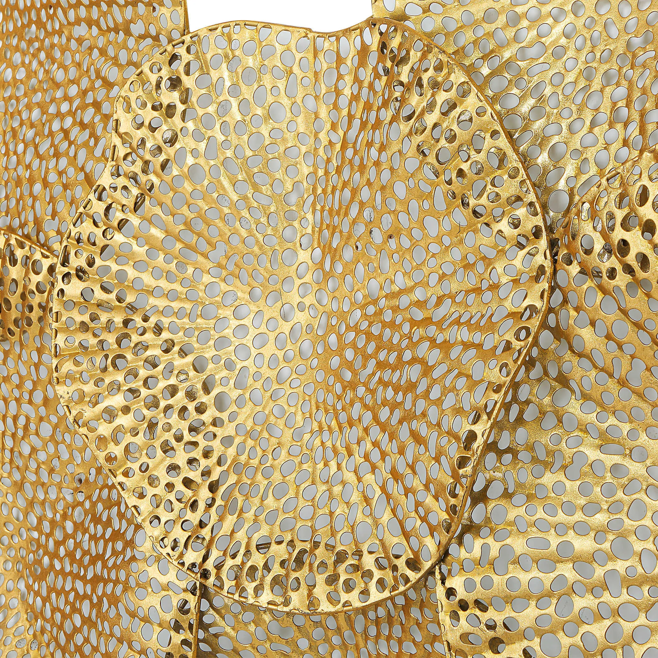 Resembling layered lotus leaves, this pierced metal wall art is finished in a lightly antiqued gold. May be hung horizontal or vertical.
