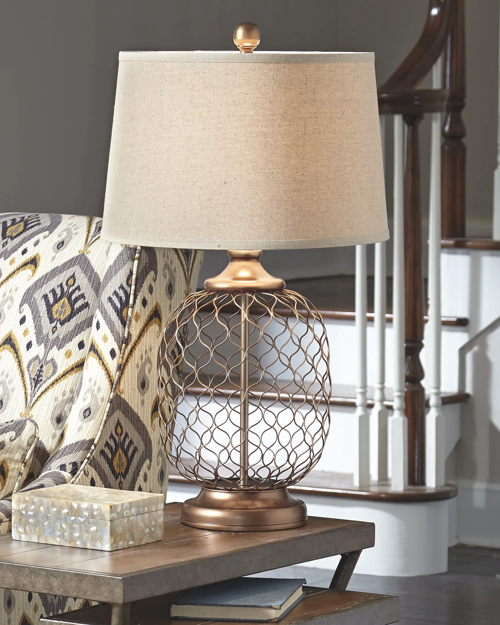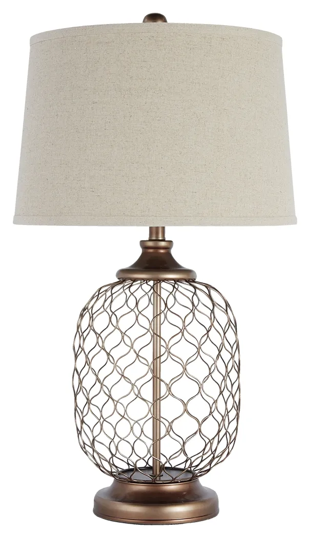Wired and inspired. This standout table lamp with an open cutout base crafted of wire mesh is clearly unique. Metallic finish casts a luminous glow. Textural shade in a soothing neutral is a natural fit.