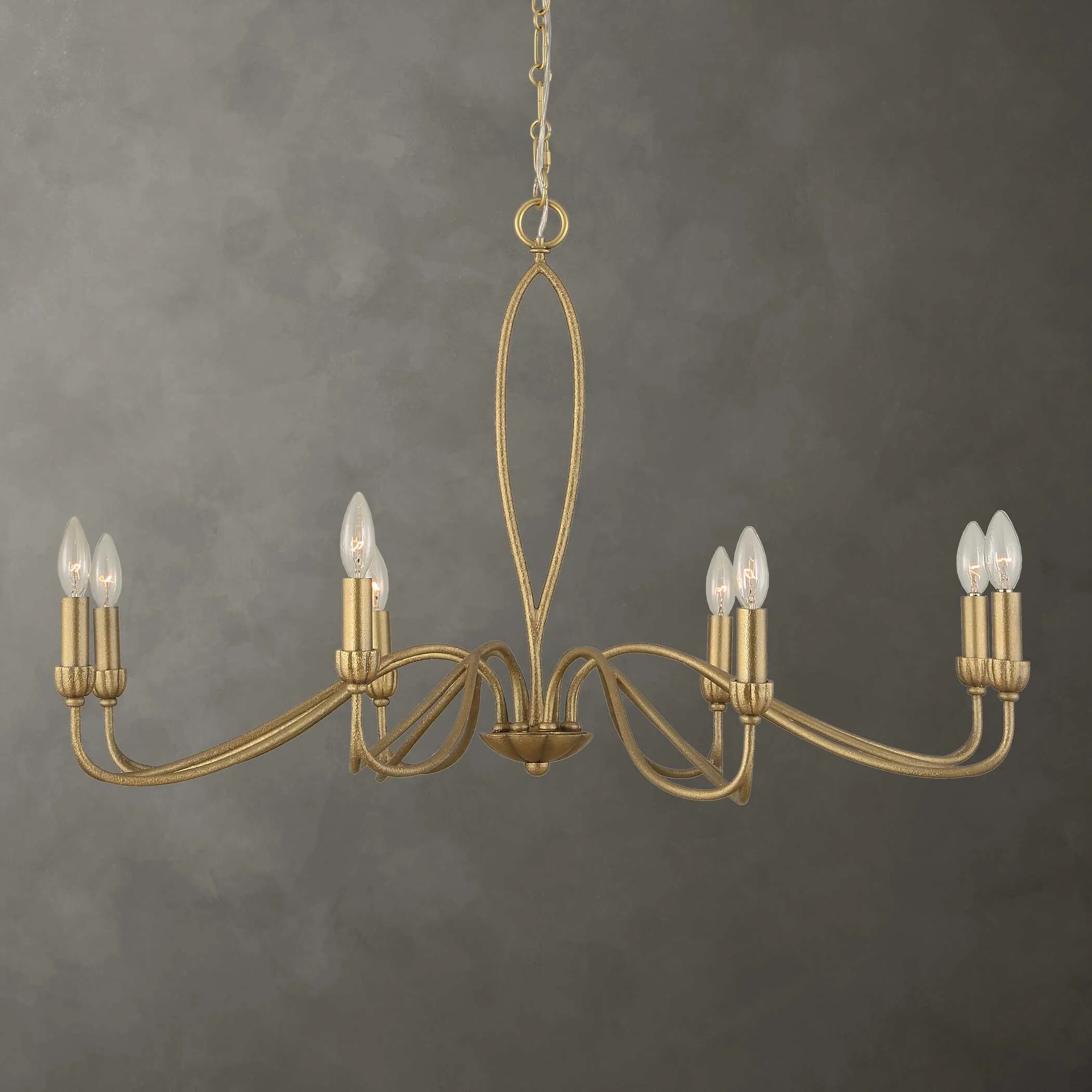 This Updated Traditional 8 Lt Chandelier Has Unique Marquise Shaped Petal Arms And A Matching Center Column. All Are Finished In A Textured Soft Gold That Refines This Look. 8-40 Watt Max Candelabra Sockets. Bulbs Not Included. Supplied With 20' Wire, 7' Decorative Link Chain For Adjustable Installation.