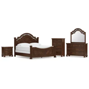 Take inspiration from the traditional luxury of this queen poster bed. Classic with a rich cherry brown finish, its stately presence graces your room with an air of opulence. Your taste for exquisite details is satisfied with the headboard’s ornate accent filigree. With an elegantly crafted footboard completing the look, your restful retreat has never been so refined.