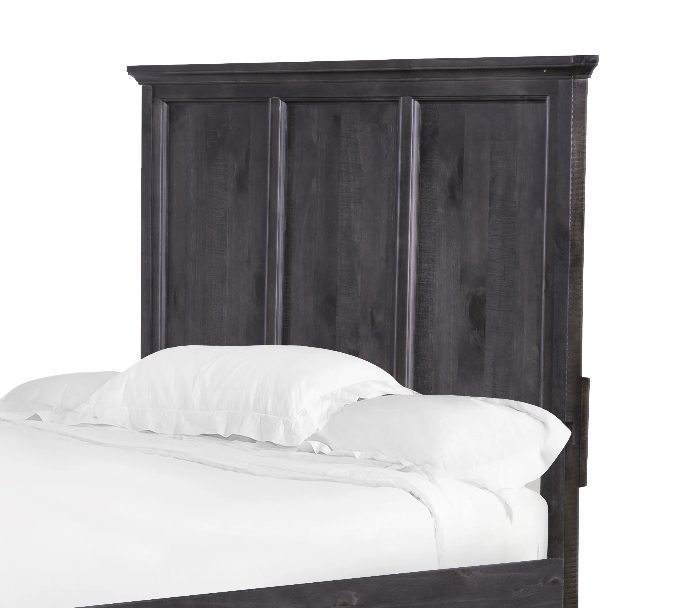 Weathered Charcoal finish and Brushed Pewter hardware give the clean shaker forms of Mill River a fresh and updated feeling. Relaxed and casual yet well designed and sophisticated enough for any setting, this handsome group features raised panel borders on drawer fronts and the smart panel bed.