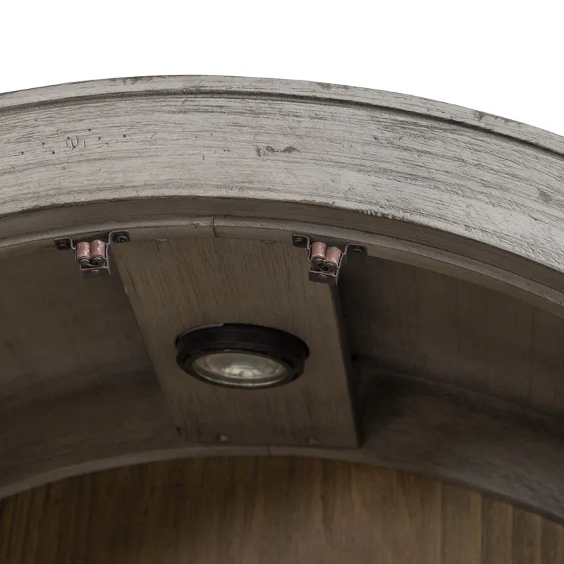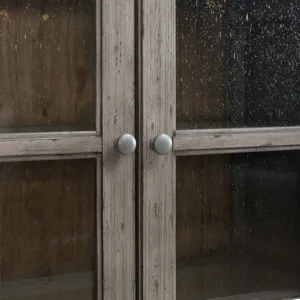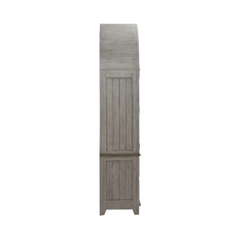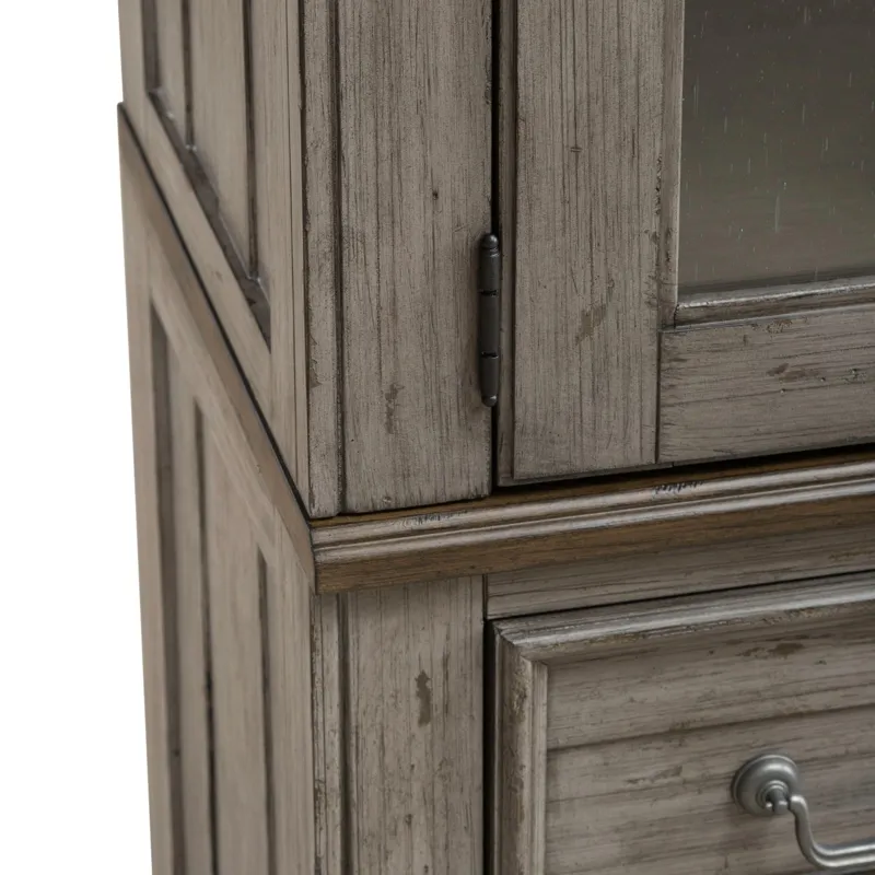 Designed to entice a sense of calm and tranquility into interior spaces, the River Place curio cabinet strikes the perfect balance of life on the coast and a comfy home tucked away in the hills. Crafted with Pine solids and veneers, this curio cabinet features a heavily distressed Riverstone Grey and Tobacco finish. The rounded profile is reminiscent of a cathedral arched window. There are two wood framed seeded glass doors with wood strip mullions. The doors open to reveal three wood framed adjustable glass shelves with plate grooves, perfect for allowing the touch LED lighting to shine through. The back panel is in the Tobacco finish and pairs well with the Riverstone Grey finish of the case. The base of the cabinet offers two full extension drawers with the added touch of soft closing drawer guides. The high-low veneer pattern of the drawer fronts and end panels add dimension. Heavy base molding draws attention to the angled tapered feet. Accented with custom Antique Pewter knob and bail pull hardware, the River Place curio cabinet creates an inviting airy atmosphere in your home while providing comfort in your own private getaway.