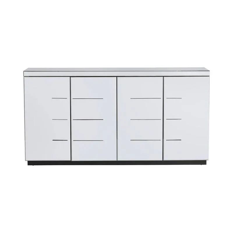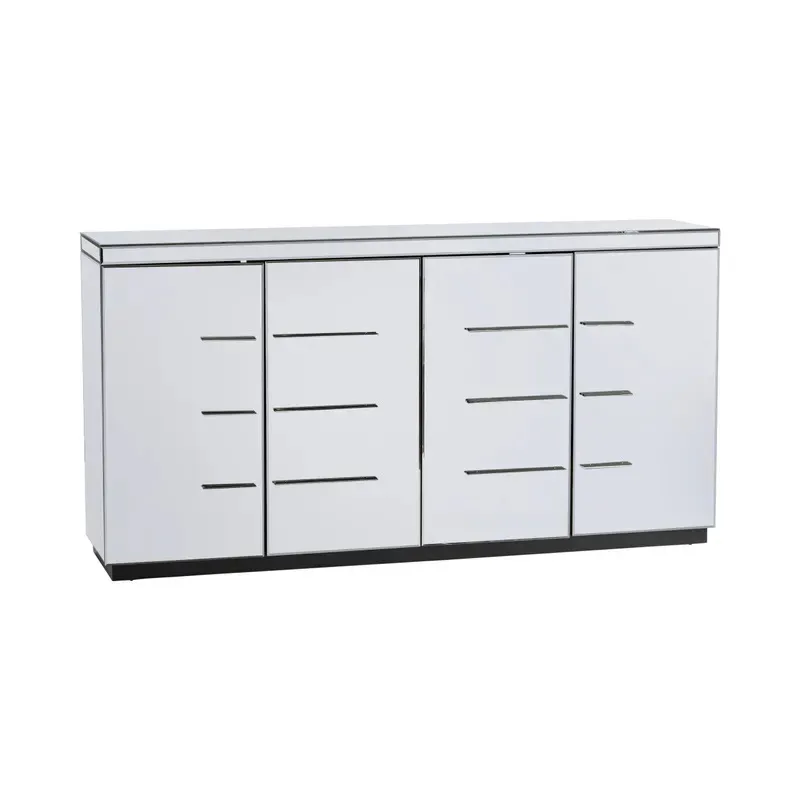 Add storage with shine with this Crestview Collection Melrose 4-door Beveled Mirror Sideboard and Chrome Hardware in your living space. Four mirrored cabinet doors with chrome accents open to reveal all the things you've tucked away, while the chrome finish frame supports each and every inch. The whole piece has beveled edges for extra personality, and is the perfect fit for your modern decor.