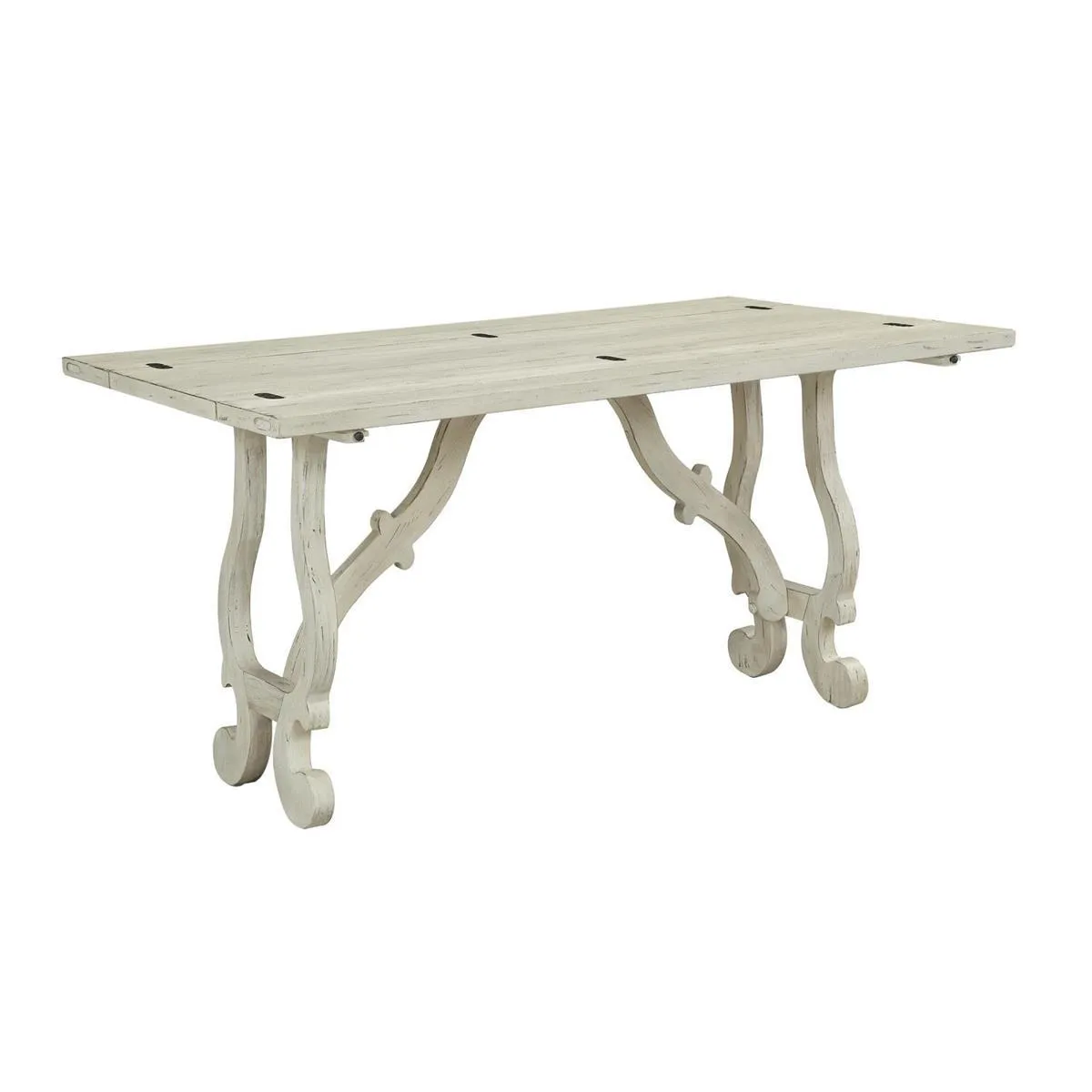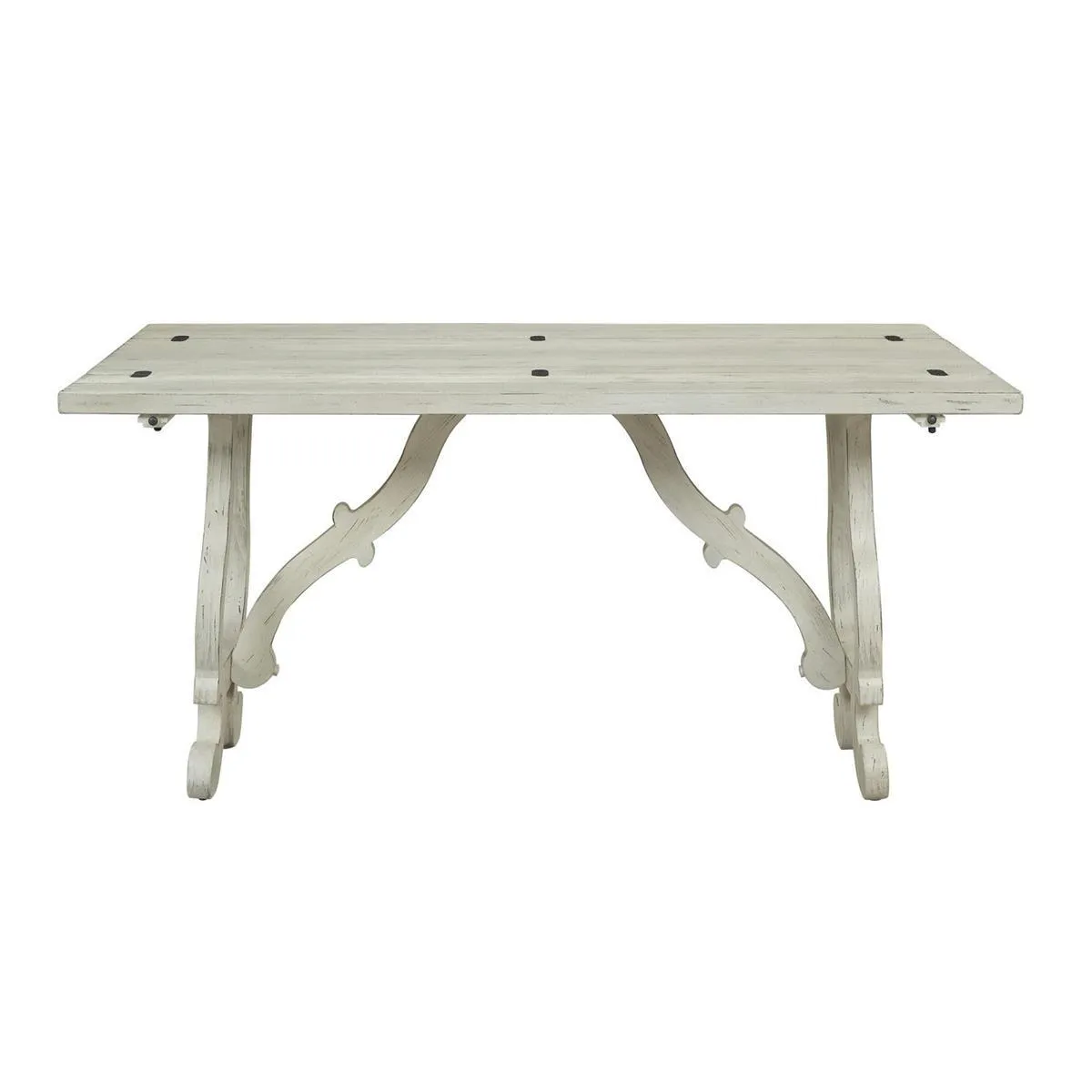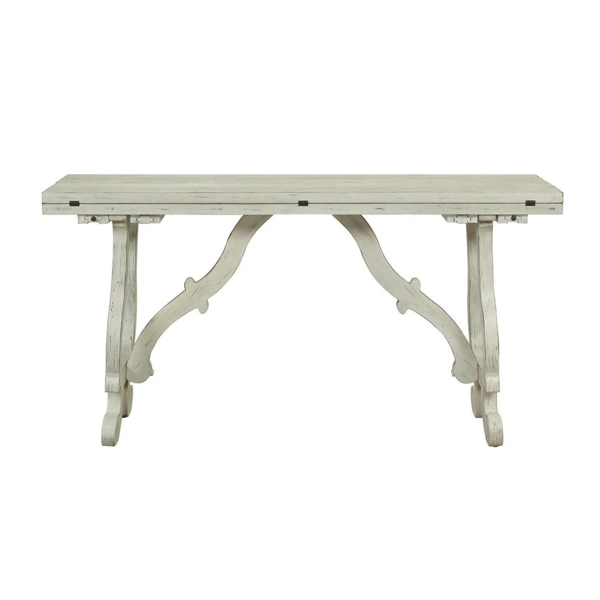 The gentle soft curve of the legs and cross bars add a lively and playful look to this charming console table! Finished in Orchard White Rub, the plank style top is hinged on either side, and can be opened when you need a larger surface for serving guest, or closed and placed under a mirror for a splendid display for your pottery collection and a pair of towering candlesticks. An ideal companion for the matching Cocktail and End Tables, or a charming addition to your kitchen or entryway.