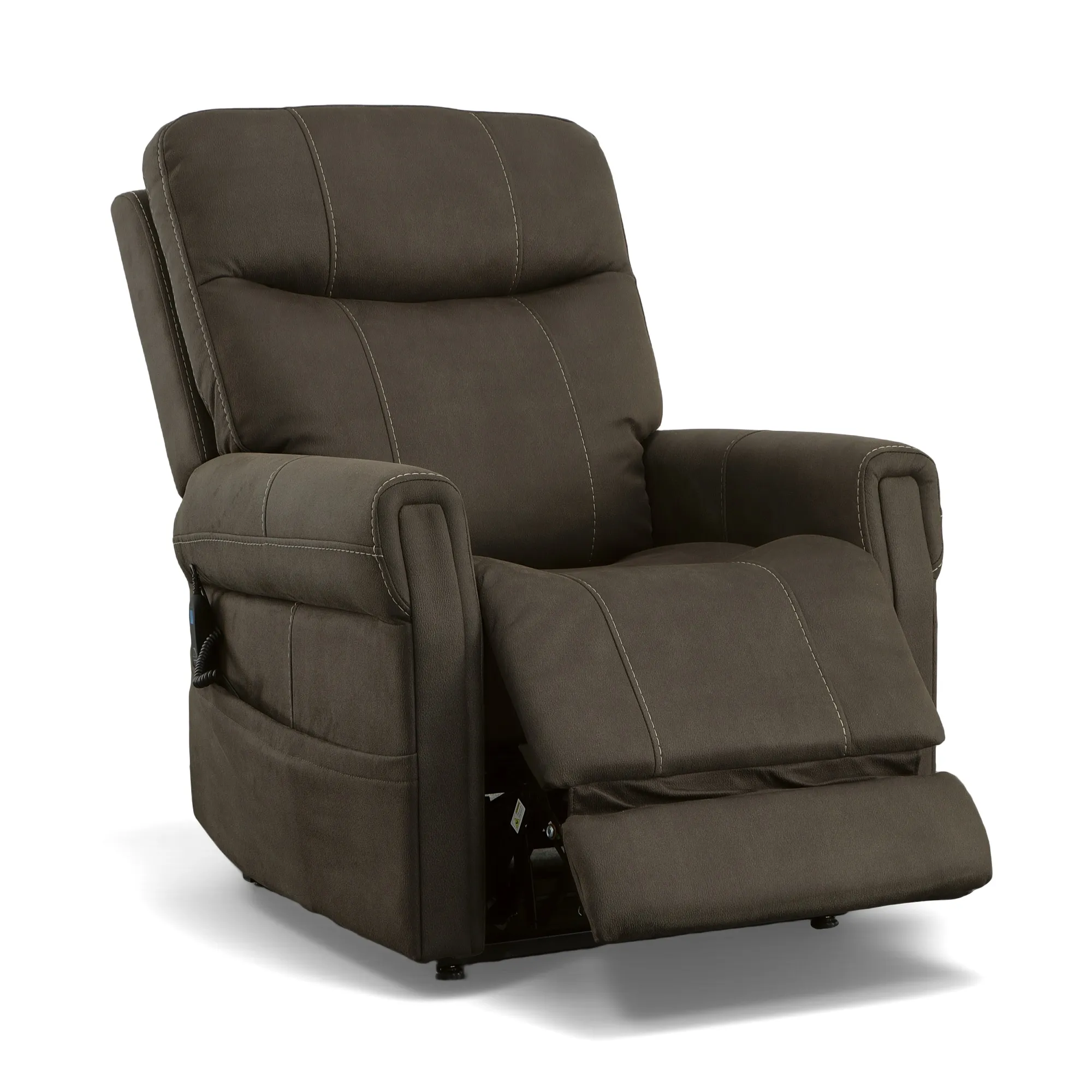 Relax in style with the clean lines of the Jenkins power lift recliner with power headrest. Showcasing pad-over arms, a plush back cushion and headrest, and an extended footrest this lift recliner provides tremendous comfort for when you're relaxing. The easy to use hand wand control allows you to adjust the recline, headrest support, and lift assistance at the touch of a button. The high-quality, bark brown fabric is easy to clean and durable for every day use. And with Flexsteel's patented Blue Steel Spring™ at the heart of it's seat, offering unmatched durability and comfort, you can kick back and relax with Jenkins.
