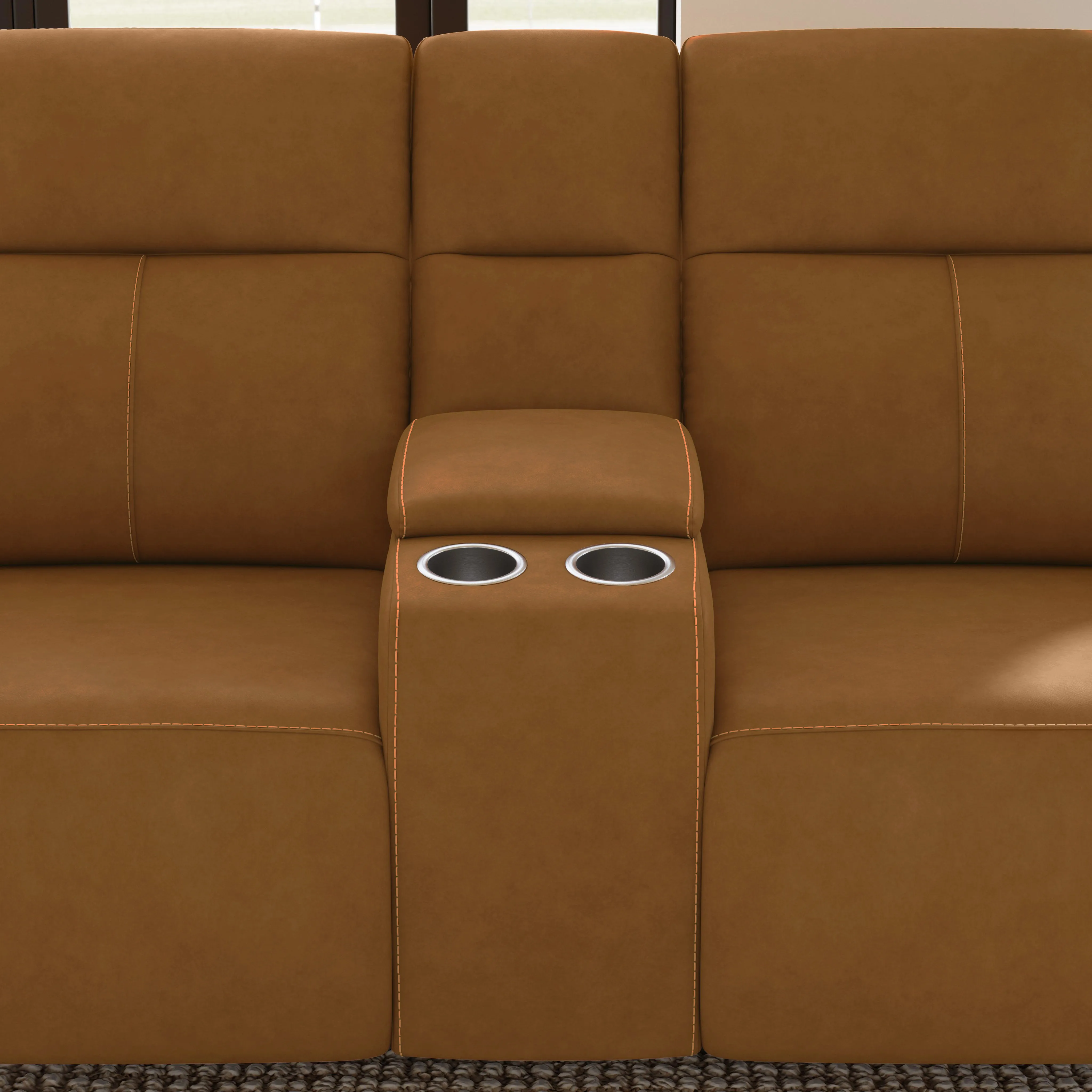 Alluring modern style merges with motion technology in the Walter leather power reclining loveseat with console. Featuring thin, pad-over sloped track arms, square tapered legs, and flat seats, Walter mirrors the look of high-end stationary furniture. Relaxation can be fine-tuned with an adjustable recline, powered headrests, and extended footrests, while high, divided backs support shoulders. Conveniently store drinks and remotes within reach and charge devices with built-in ports. Upholstered in a high-quality, honey brown leather, the Walter power reclining loveseat is designed for lasting beauty.