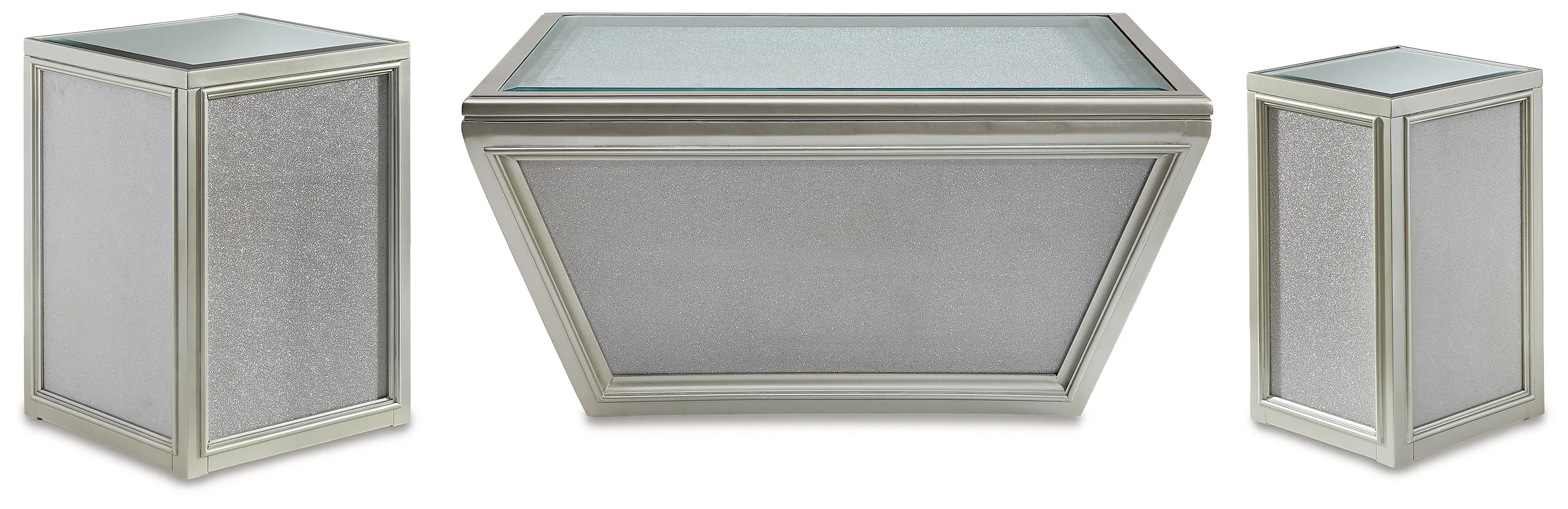 Reminiscent of Hollywood glamour of yesteryear, this coffee table interprets luxury in a decidedly modern way. Featuring a beveled inset mirrored tabletop, textured laminate panels for added luster and casters for easy mobility, it brings that touch of glam you've been yearning for. 2 Matching end tables included.