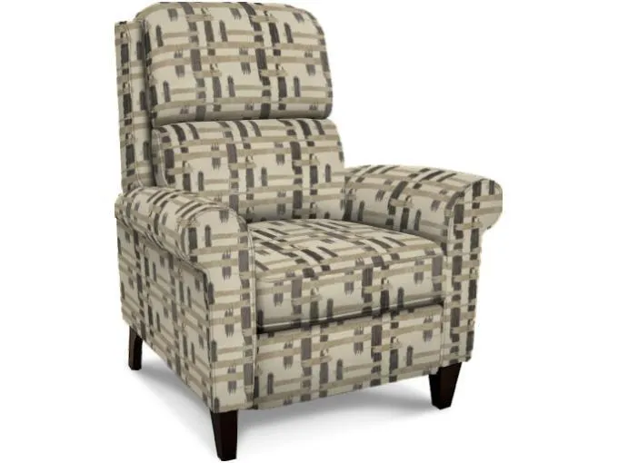 The ultimate basic, the Kenzie chair features a high back perfect for relaxing after a long day. With its pub back, tailored rolled arm and tapered wood leg, it is a perfect accent to any home. This casual press back recliner is also available with a power option. Take a look at Maddox for the all leather version!